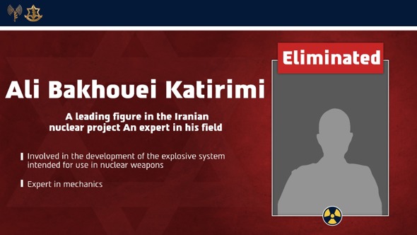 “During the Israel’s Air Force fighter strikes at the onset of Operation “Rising Lion”, nine senior scientists and experts, who advanced the Iranian regime’s nuclear weapons program, were eliminated. The strike was made possible thanks to precise intelligence gathered by the Intelligence Directorate. All of the eliminated scientists and experts served as significant knowledge centers in the Iranian nuclear project and possessed decades of accumulated experience in the development of nuclear weapons,” Israel’s Defence Forces said in a press release.